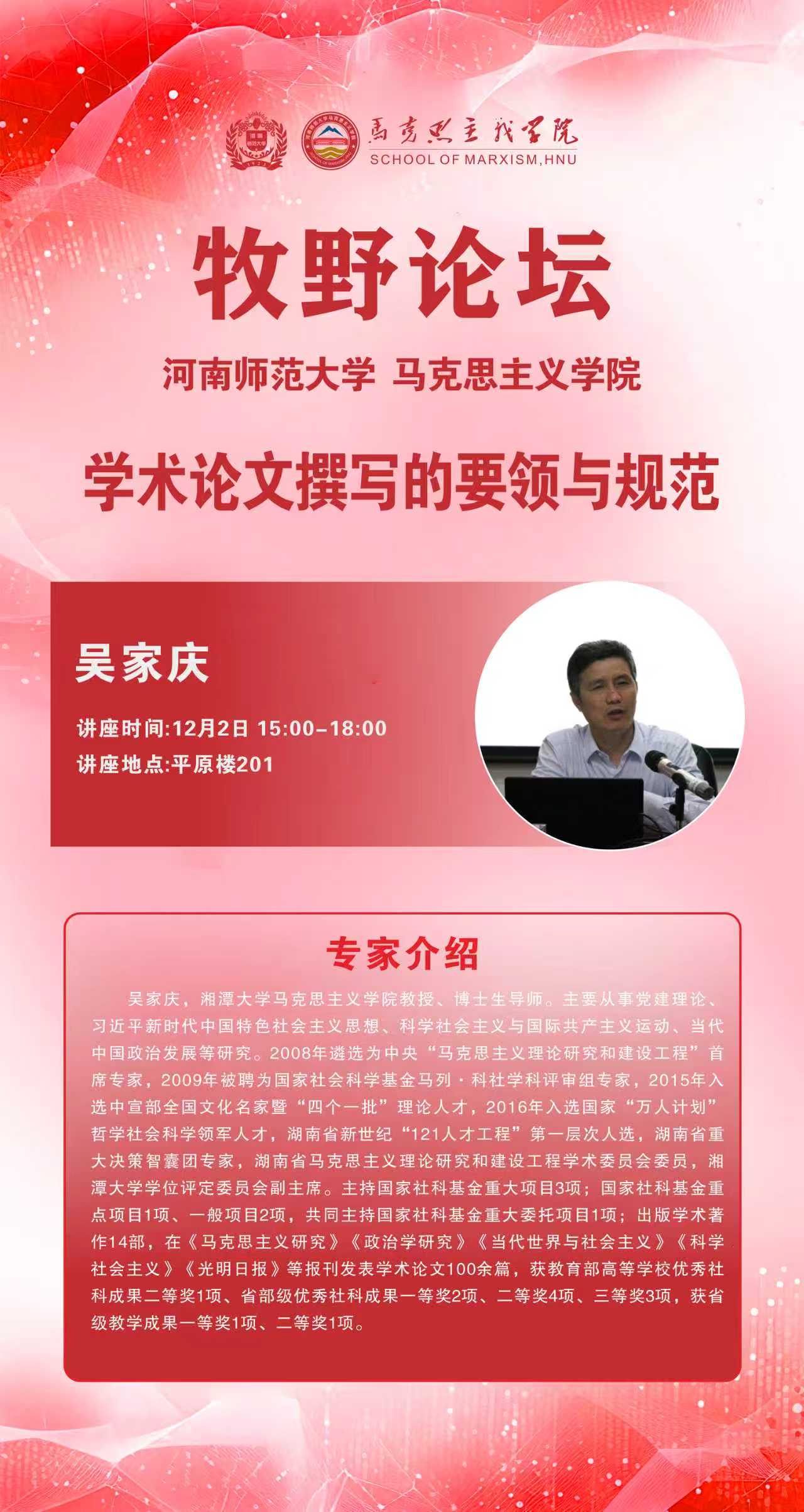 湘潭大学吴家庆教授将应邀做客“牧野论坛”