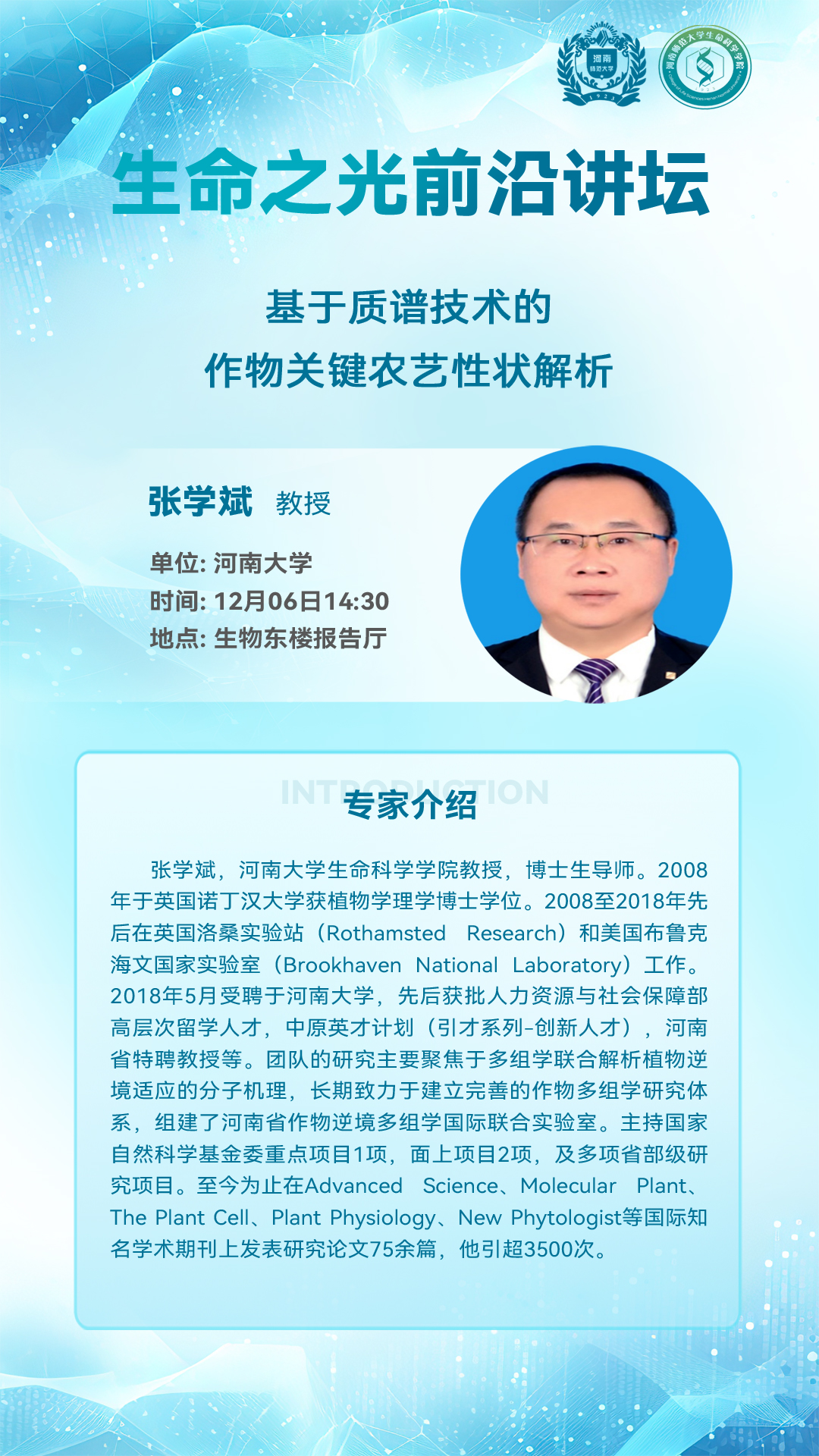 河南大学张学斌教授将应邀做客“生命之光”前沿讲坛