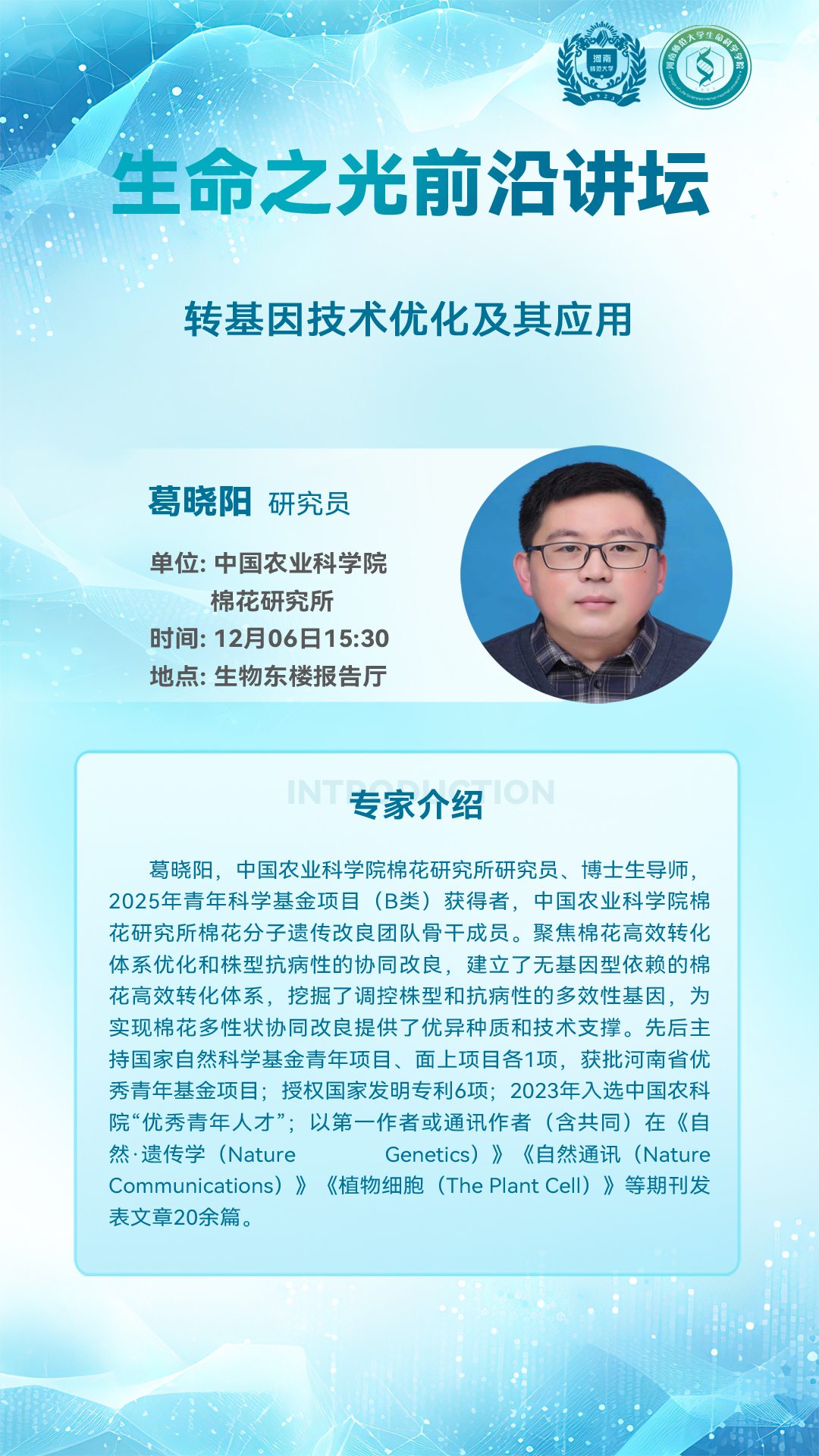 中国农业科学院棉花研究所葛晓阳研究员将应邀做客“生命之光”前沿讲坛