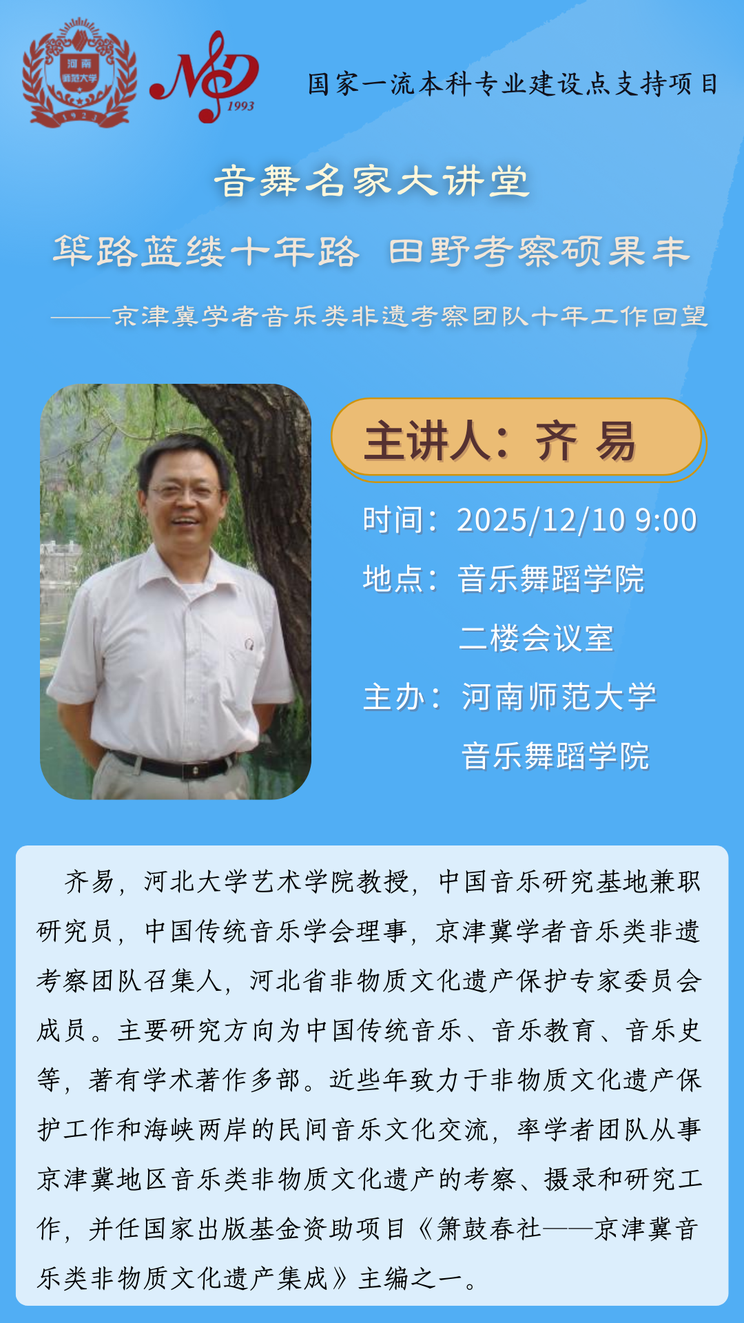 河北大学齐易教授将应邀做客“音舞名家大讲堂”