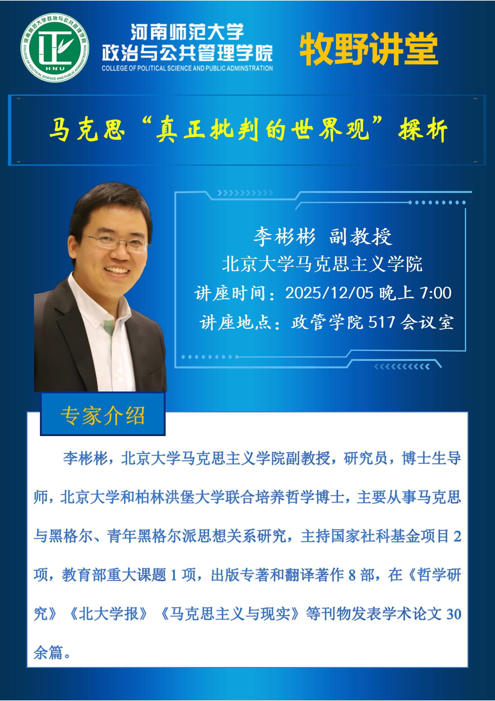 北京大学李彬彬副教授将应邀做客“牧野讲堂”