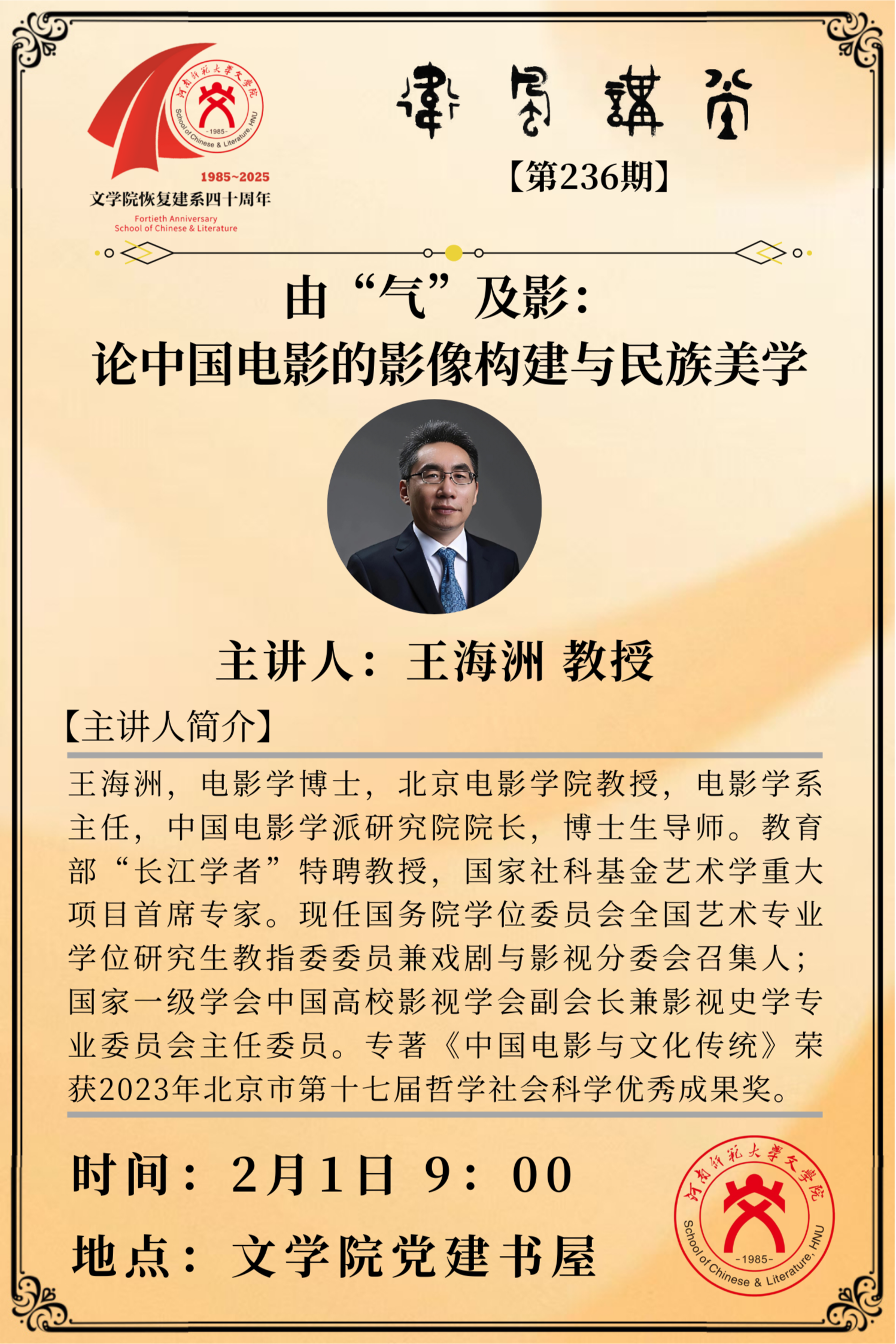 北京电影学院王海洲教授将应邀做客文学院“卫风讲堂”