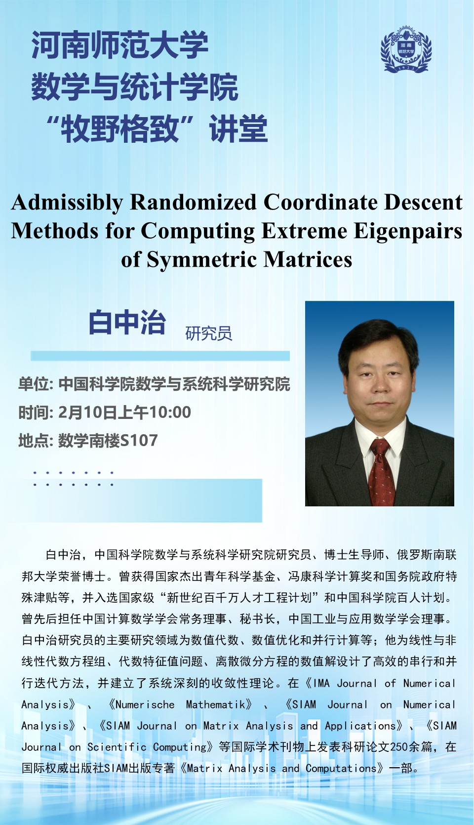 中国科学院数学与系统科学研究院白中治研究员将应邀做客“牧野格致”讲堂