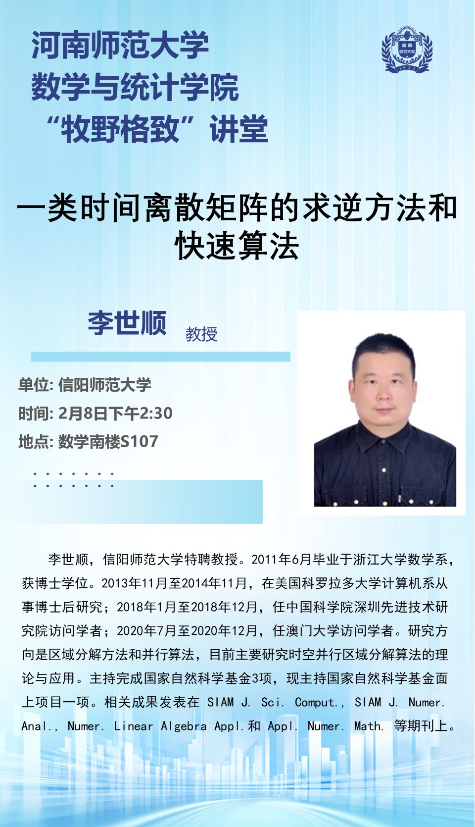 信阳师范大学李世顺教授将应邀做客“牧野格致”讲堂