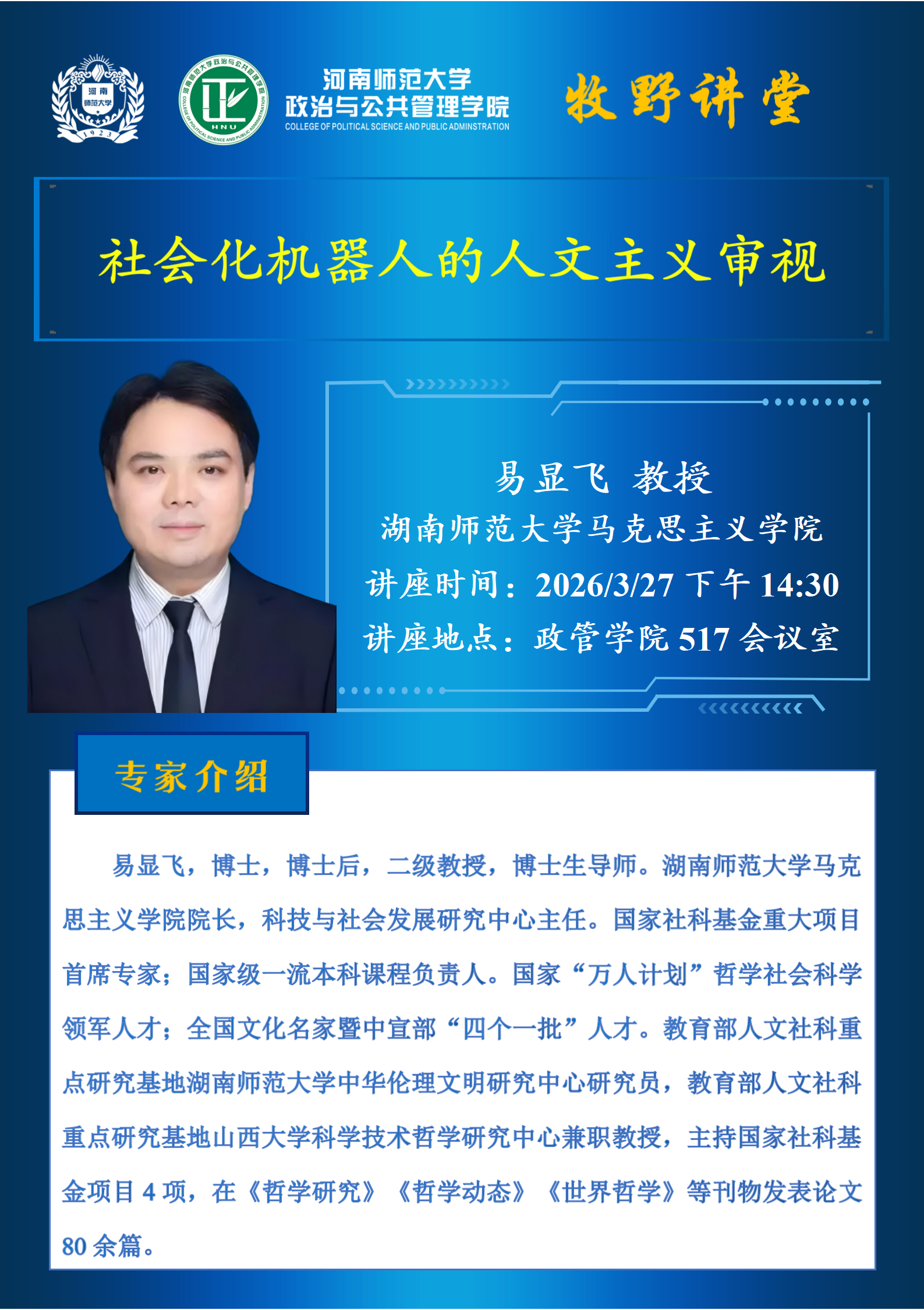 湖南师范大学易显飞教授将应邀做客“牧野讲堂”