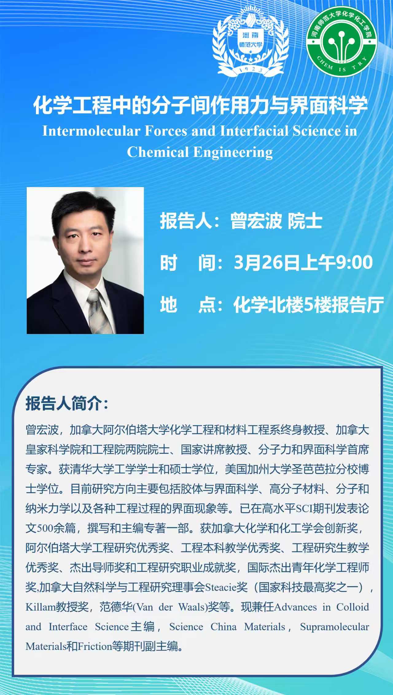 加拿大阿尔伯塔大学曾宏波院士将应邀做客“俊甫讲堂”