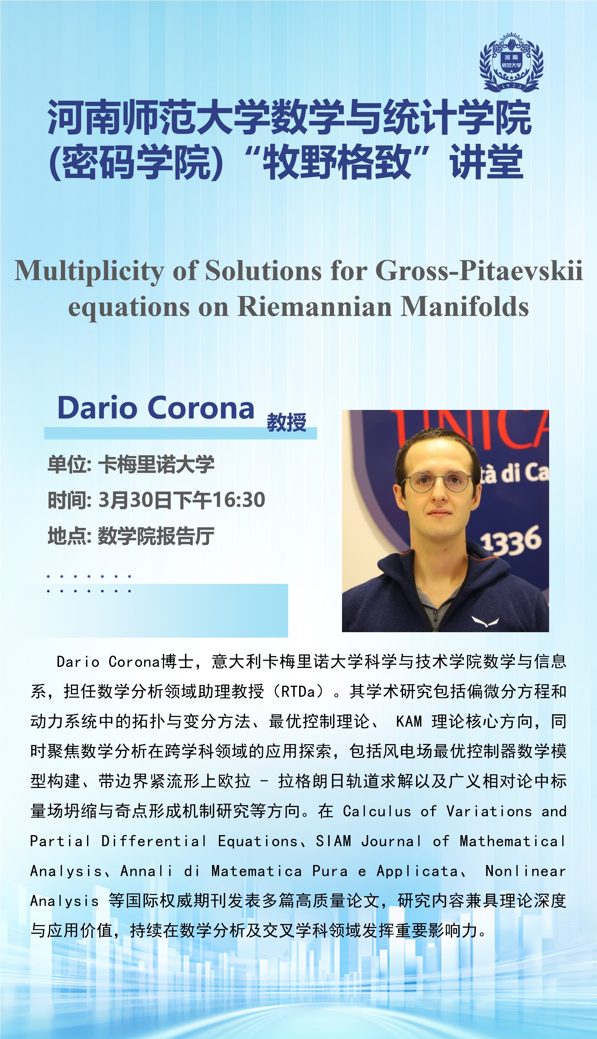 意大利卡梅里诺大学Dario Corona教授将应邀做客“牧野格致”讲堂