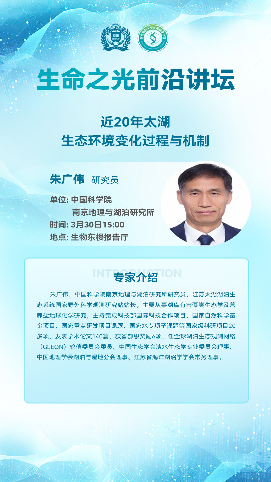 中国科学院南京地理与湖泊研究所朱广伟研究员将应邀做客“生命之光”前沿讲坛