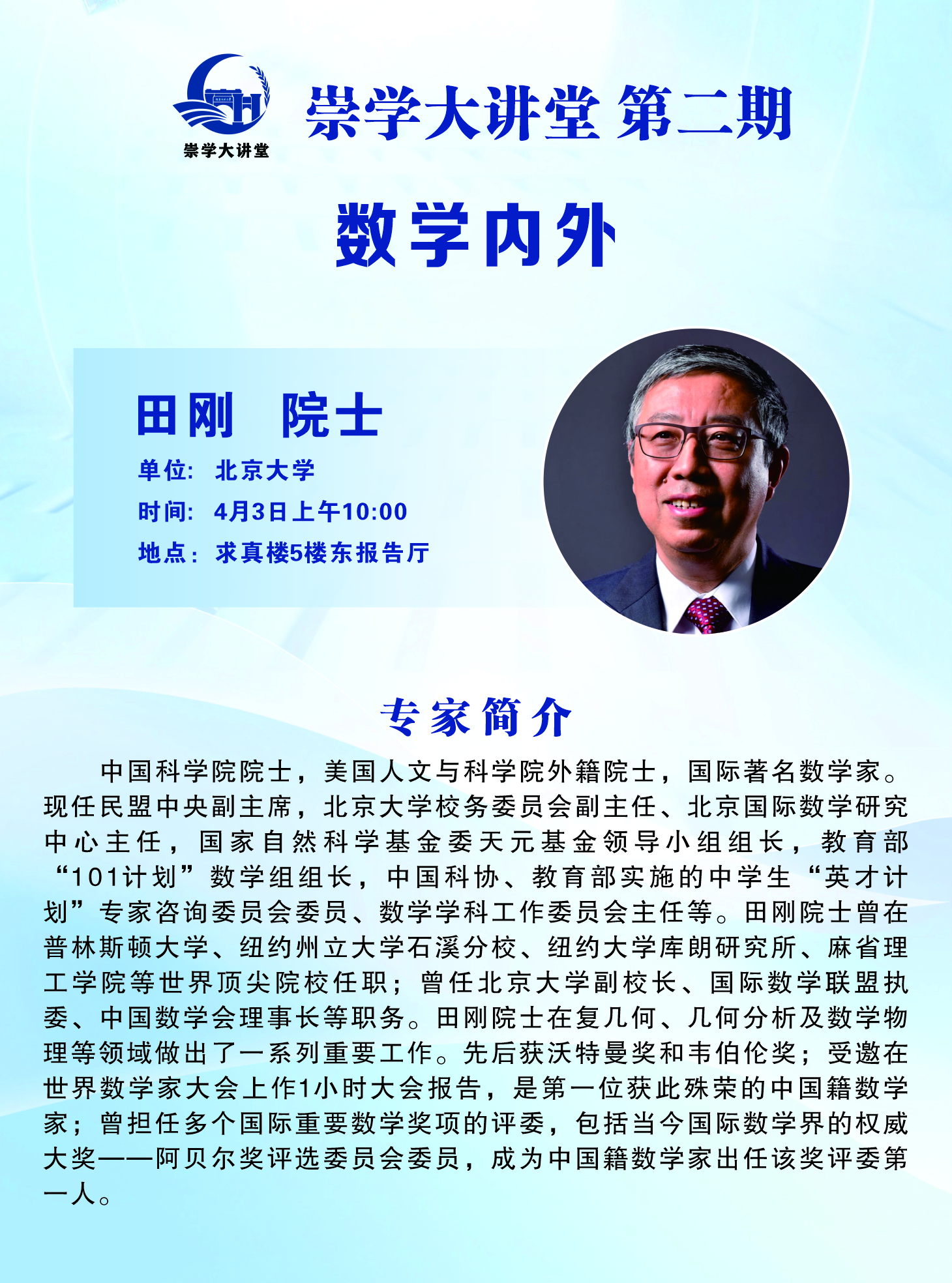 北京大学田刚院士将应邀做客“崇学大讲堂”