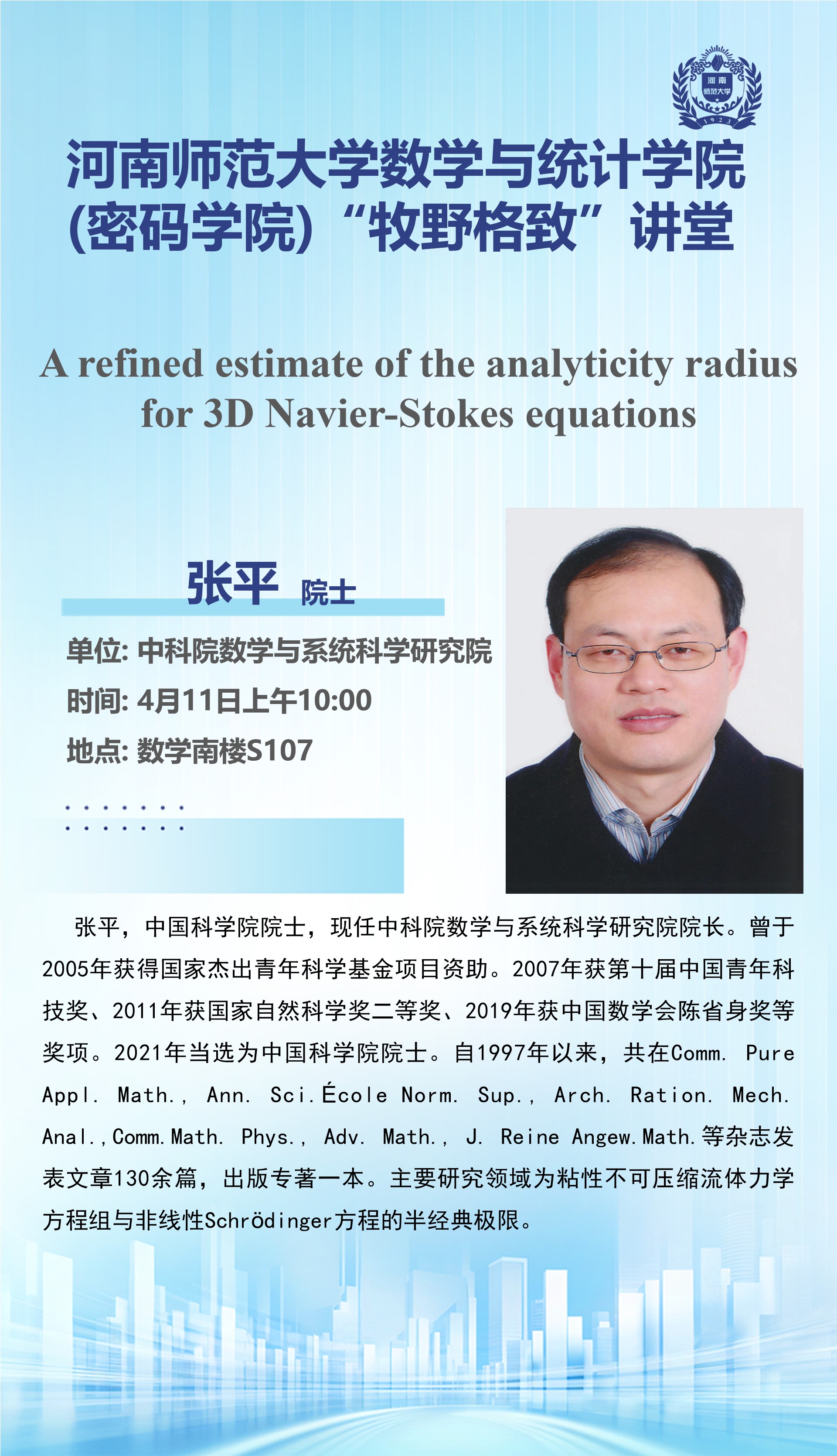 中国科学院数学与系统科学研究院张平院士将应邀做客“牧野格致”讲堂
