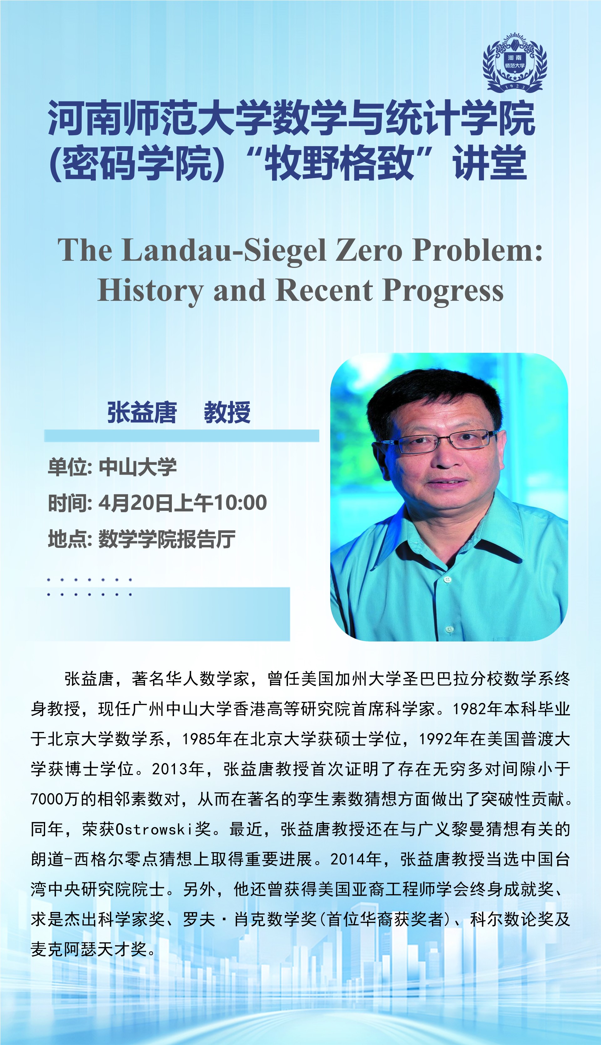 中山大学张益唐教授将应邀做客“牧野格致”讲堂