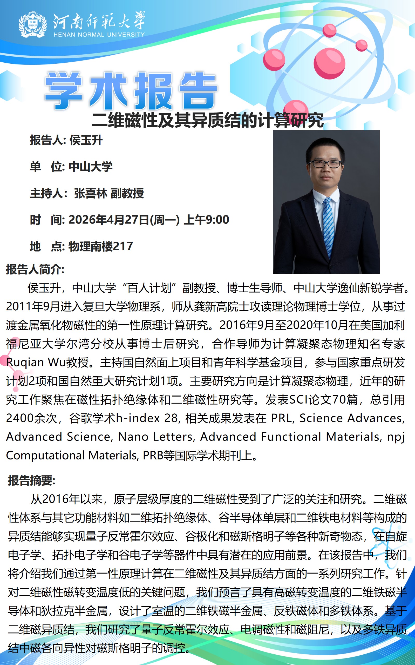 中山大学侯玉升副教授将应邀做客“八角楼”讲坛