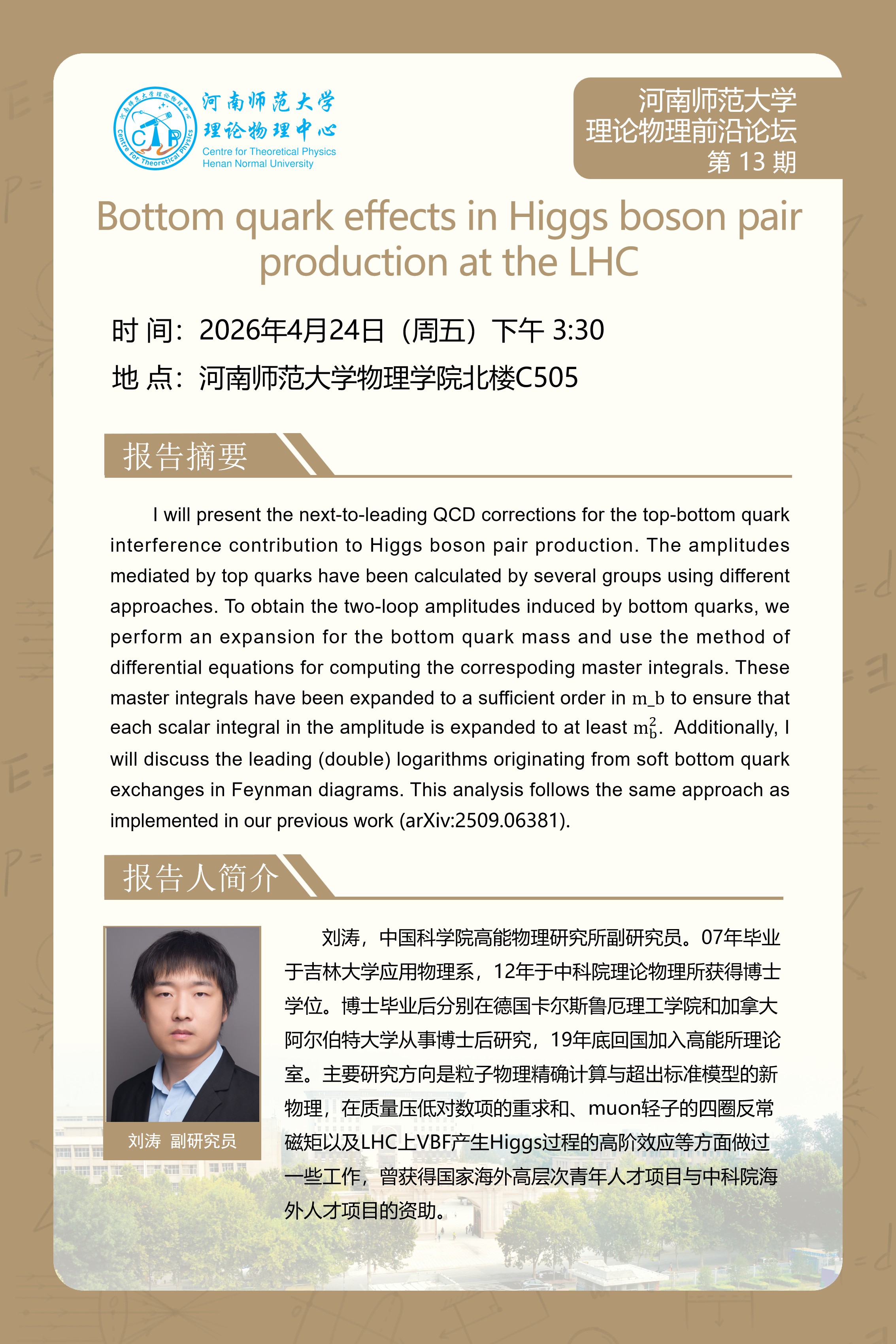 中国科学院高能物理研究所刘涛副研究员将应邀做客“理论物理前沿论坛”